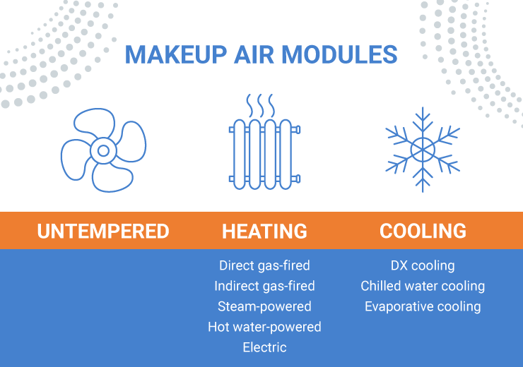 Make Up Air Units: A Guide to Different Models for Different Needs Posted on August 24, 2022 In the previous article, we explained the concept of makeup air and its necessity for most indoor buildings. In this installment, we delve into what a makeup air unit is and explore the different types of makeup air systems tailored for various applications. Contents ToggleWhat is Makeup Air?What are Makeup Air Units?Components of a Makeup Air UnitWhat are Makeup Air Modules?Types of Makeup Air ModulesMakeup Air FanDirect Gas Fired HeatIndirect Gas Fired HeatNon-Gas Fired Makeup Air UnitsDX CoolingChilled Water CoolingEvaporative CoolingWhere are Makeup Air Systems Required?Residential HomesMinimum Ventilation RequirementsOur Recommended Makeup Air UnitsFor Residential Makeup Air What is Makeup Air? Makeup air is controlled outside air that replaces the air exhausted from inside the building. As indoor air is expelled, it creates negative pressure, causing outside air to rush in to fill the void. What are Makeup Air Units? Makeup air units are devices designed to compensate for pressure differences and ensure an adequate supply of filtered air for safety and comfort. Without makeup air systems, sealed structures can experience issues caused by negative interior air pressure, including: Contaminants and allergens Persistent odors Humidity problems Inefficient HVAC operation Higher utility costs Components of a Makeup Air Unit A makeup air unit shares many components with fans, air handlers, or air conditioners. The major parts include: Key Components of a Makeup Air Unit Intake: The opening where outside air enters and feeds into the unit. Back-draft Damper: Controls airflow to move only in one direction, preventing reverse airflow. Essential for maintaining air quality and system integrity. Filters: Trap contaminants like pollutants, toxins, and allergens, ensuring clean air enters the building. Heating/Cooling Elements: Modify the temperature of incoming air for occupant comfort and reduced HVAC load. Ducts and Registers: Transport processed air throughout the interior spaces. Exhaust Fan: Expels used air out of the building, maintaining air balance. Optional features and advanced functions may include: Recirculation features Variable volume control Building pressure controls High-temperature discharge Multi-stage or ultraviolet light filtration What are Makeup Air Modules? Some makeup air units are modular, allowing for additional heating or cooling sections. This design is particularly suited for larger or industrial models, providing flexibility to meet varying needs and operational requirements. Types of Makeup Air Modules Makeup air modules vary primarily based on air treatment or cooling methods. The main types include: Varieties of Makeup Air Modules Makeup Air Fan Also known as an untempered makeup air unit or fan box, this is the simplest type of MUA. It consists of an intake fan that brings in air without any heating or cooling equipment, ideal for consistent temperate climates or where specific indoor conditions are not critical. Direct Gas Fired Heat A direct-fired makeup air heater uses natural gas or propane to heat incoming air before circulating it into the building. This method is highly efficient, delivering 100% of generated heat into the interior. However, it introduces gas byproducts, which must be managed with proper filters and safety equipment. ANSI standards mandate that up to 85% of the air can be recirculated. Direct gas-fired MUAs can be further classified into: Compact low CFM Direct Fire Heater Modular Direct Fired Heater Horizontal Industrial Direct Fired Heater Vertical Industrial Direct Fired Heater Indirect Gas Fired Heat These units use an indirect heating method similar to home furnaces, where a heat exchanger contains the gas flame, ensuring no gas byproducts mix with the air. Although less efficient than direct-fired MUAs, they provide cleaner air suitable for spaces sensitive to mold. Non-Gas Fired Makeup Air Units These MUAs are powered by steam, hot water, or electricity, each with its own advantages and limitations compared to gas-fired systems. DX Cooling Direct Expansion (DX) cooling uses refrigerant coils to cool the air supply. The refrigerant absorbs heat as air passes through the coils, and the system can be configured with built-in or modular condensers. Chilled Water Cooling Chiller units use cold water to cool the air, suitable for large air handling units servicing extensive indoor spaces. Evaporative Cooling Evaporative coolers add humidity to the air, ideal for hot and dry climates to maintain interior humidity while cooling. Where are Makeup Air Systems Required? Residential Homes Impact of Makeup Air in Sealed Homes Tightly sealed houses can result in unequal pressure, even when doors are opened. Powerful range hoods and other appliances can cause negative air pressure, leading to unfiltered air seeping in through gaps, holes, or cracks. The most common exhaust appliances include: Bathroom exhaust fans (40‐200 CFM) Clothes dryers (100‐225 CFM) Kitchen range hoods (100‐1,500 CFM) According to the International Residential Code Section M1503.4 and the International Mechanical Code Section 505.2, makeup air units are required for all domestic range hoods exceeding 400 CFM, equipped with at least one damper. “Exhaust hood systems capable of exhausting in excess of 400 cfm (0.19 m3/s) shall be provided with makeup air at a rate approximately equal to the exhaust air rate. Such makeup air systems shall be equipped with a means of closure and shall be automatically controlled to start and operate simultaneously with the exhaust system.” Minimum Ventilation Requirements Space Occupant Density (per 1,000 sq. ft) CFM per Person CFM per Sq Ft. Exhaust Airflow Rate (CFM / sq ft) Living areas 1st bedroom: 2 Succeeding bedrooms: 1 per room 0.35 ACH, and at least 15 CFM / person N/A N/A Bathroom N/A N/A N/A 20/50 The ASHRAE Standard 62.2 also ma